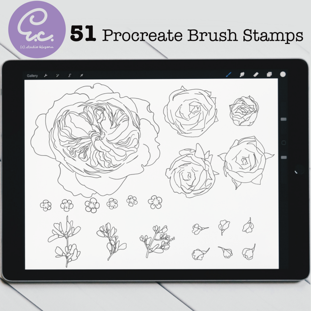 51 hand drawn floral Procreate stamps easily to create a floral arrangement, wreath, mandalas, or add them to your existing illustrations or stationary designs. There are no limits to your creativity.